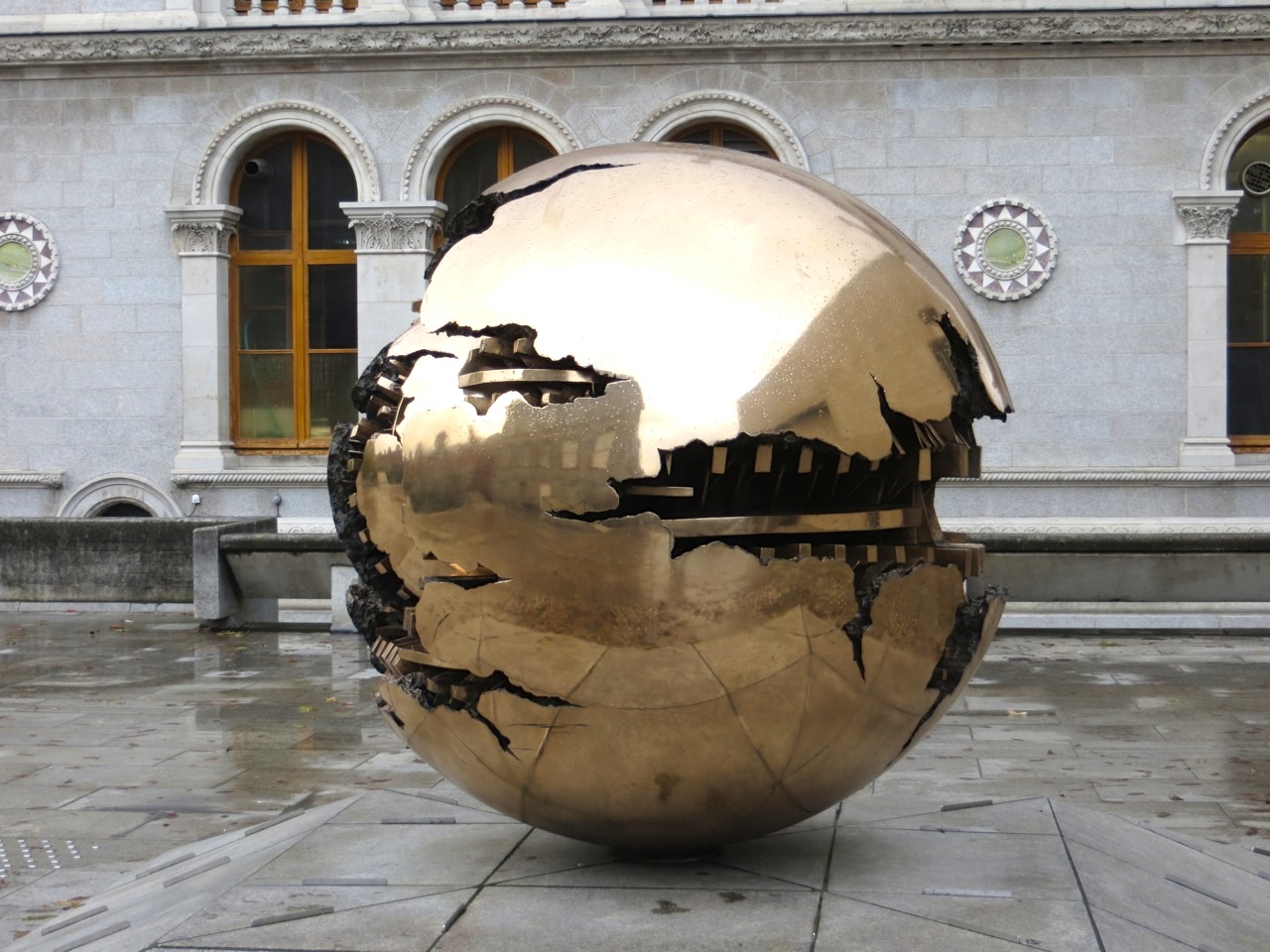 On closer inspection, it was fascinating. The large bonze was donated to TCD by the artist, Arnaldo Pomodoro. As the TCD website says, “other similar works exploring this spherical format are on display at locations such as the United Nations plaza in New York, the University of California at Berkeley, the Museum of Contemporary Art in Tehran, the Ministry of Foreign Affairs in Rome, and the Cortile del Belvedere at The Vatican Museums. This sculpture underwent a major conservation project in 2008 which brought the surface of the piece back to its original condition while also restoring its complex sub-structure and pivot.”