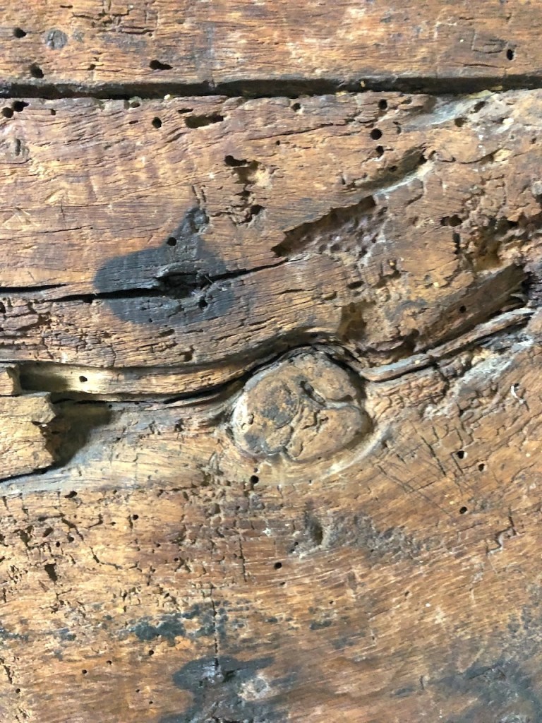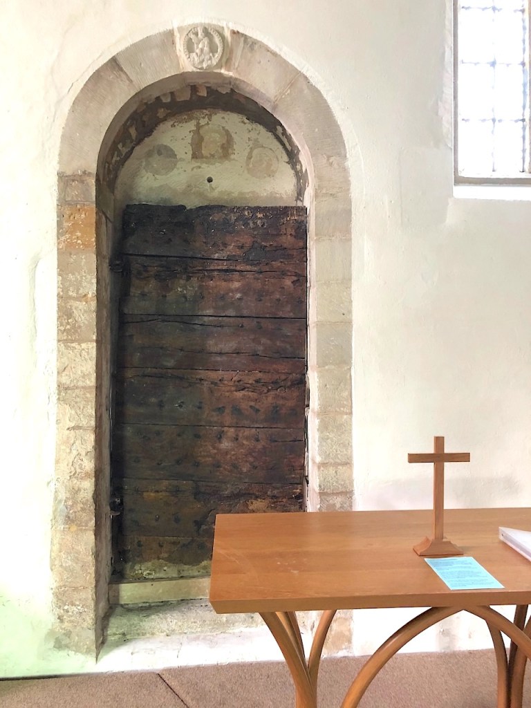 Behind the new Altar is an ancient wooden door set into the narrow arched north doorway. A plaque states that this is ‘the oldest door with original hinges in the country’. One theory is that the door is pre-Conquest, later incorporated into the Norman church built sometime between in the late C11 and 1200. Owen Morshead dates it C12; Pevsner describes it a ‘a good early door‘. So it is certainly early medieval and – whether or not actually the oldest door with original hinges – it is remarkable for its battered beauty and its overall condition.