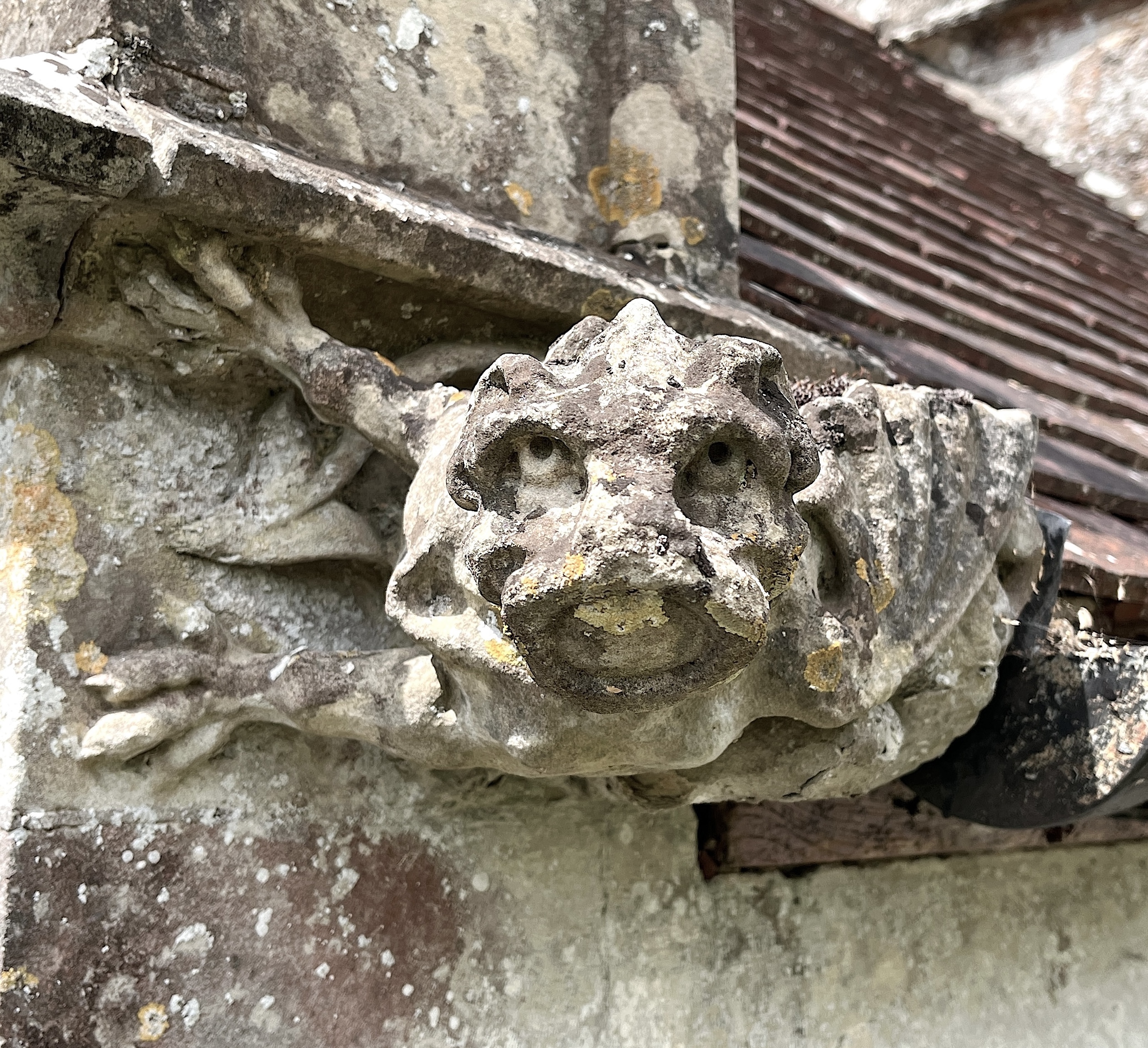 Wherever they are found, hunky punks all have a common factor: they are distinct from gargoyles. They may be very similar in design and style, but they have different functions. Gargoyles are working grotesques, usually acting as outlets for rainwater on church roofs. A length of lead pipe – or metal or (occasionally / regrettably) plastic – is the sign of a gargoyle. This usually but not invariably protrudes through the stone mouth.