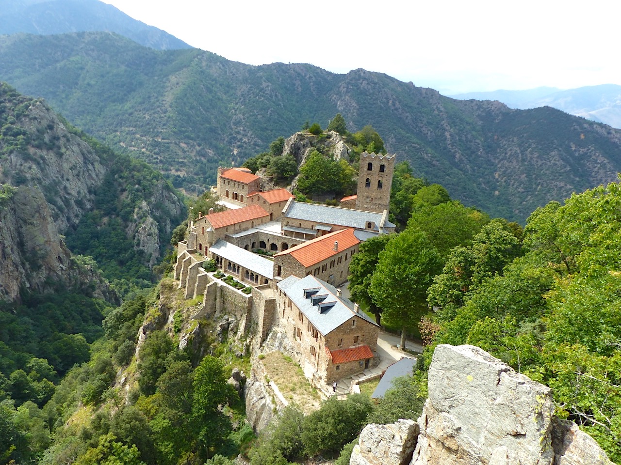 The Abbey is pleasingly inaccessible. Leaving aside a precipitous donkey track down a cliff, there is an easier track that leads up from the little village of Casteil. On certain days, at certain times, this can be negotiated by going in a small trailer drawn by a kind of skinny quadbike. Or else, it’s shanks’s pony. The steep walk is said to take 30 – 50 minutes. You’d have to be fit to reach the abbey in less than half an hour. We took 45 minutes, overtaken at intervals by serious walkers with kit to match. And gratifyingly, we overtook several puffing, wheezing and (frankly) sweaty pilgrims in our turn.