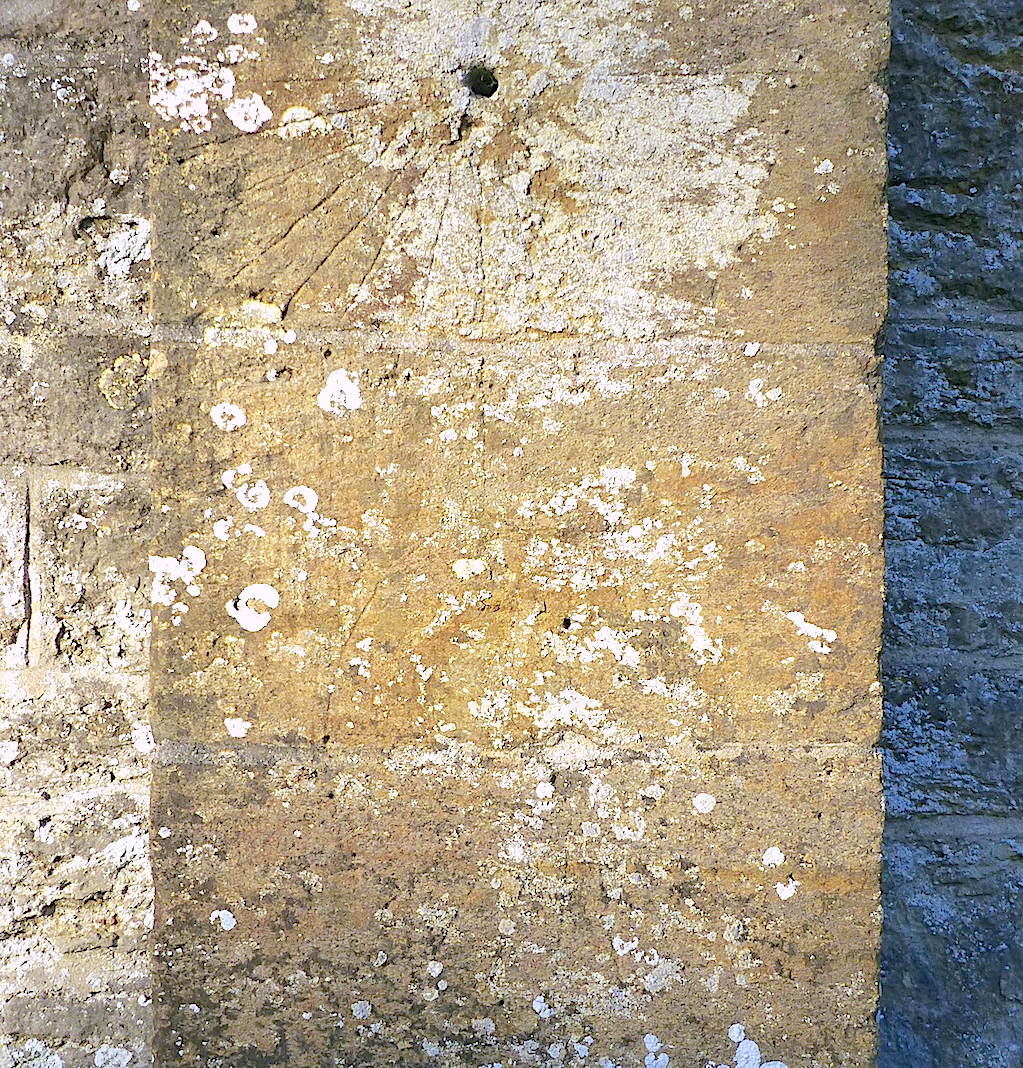 Dials, for obvious reasons, are most usually found on the south side of a church. Favoured locations are the porch, the priest’s door, and a S. or SW. facing buttress. In some cases – especially on buttresses – more than one dial was incised. St Mary Bradford Abbas has an unusual example of large, similar dials overlapping. Repairs, as here, are often unsympathetic.