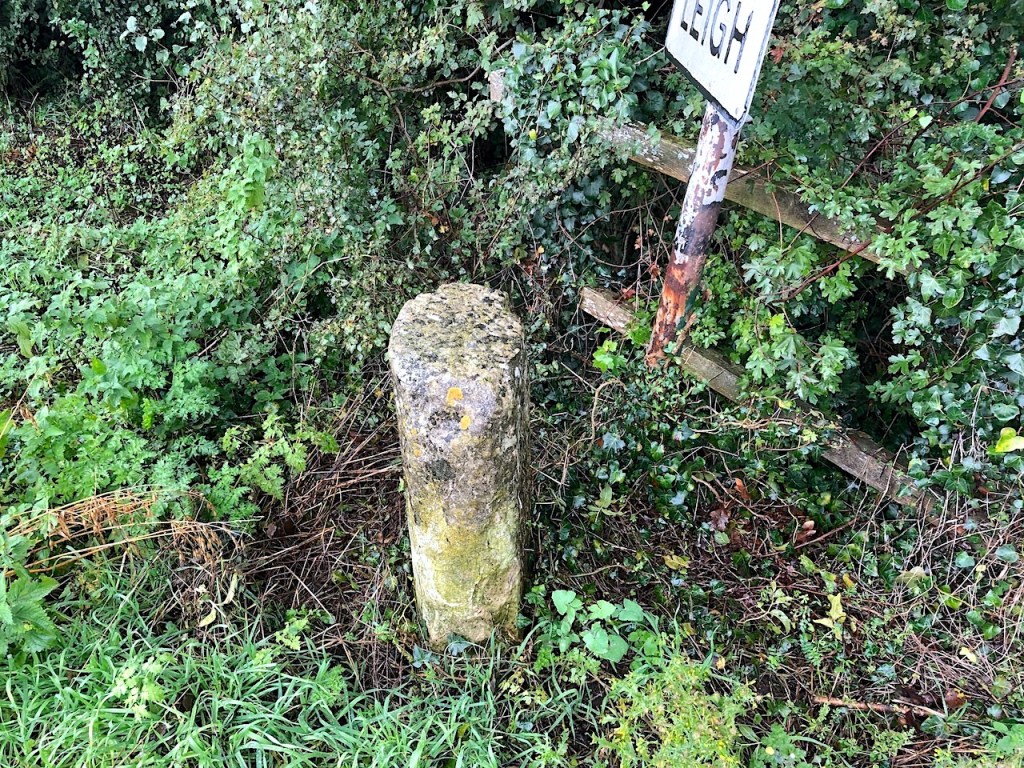 The village of Leigh is about 5 miles south of Sherborne. We live at the top of a steepish hill to the north. We must have been past this boundary marker on foot and by car thousands of times over the years. Yet neither of us had ever noticed it until, during a recent rainy walk, my wife pointed it out.