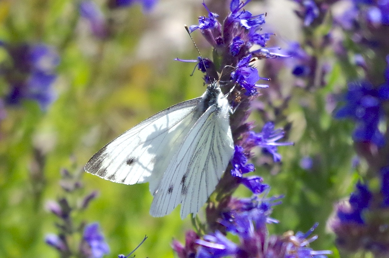 These cabbage whites – a name redolent with faint scorn (contrast Purple Emperor, Red Admiral, Peacock etc) – were out and about on a warm Dorset July day. They couldn’t actually get at the cabbages / purple sprouting broccoli, where they no doubt would have liked to lay their eggs – too well covered over. So I decided to see if they merited a photo-shoot in their own lepidopteran right. I think close-to they have their own beauty.
