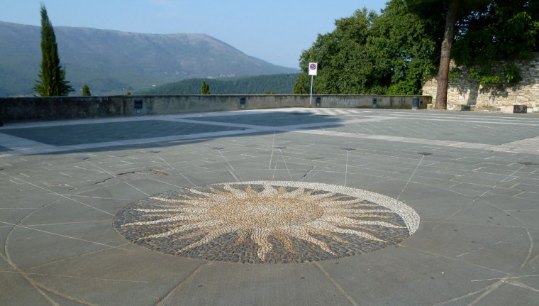 The sundial takes up a substantial area of the large piazza, and consists of a central sun/moon stone mosaic with radiating ‘sight’ lines to small brass plates numbered from VI to XVIII (in fact number VI is missing, the rest are there). The gnomon is the person who stands at the centre of the sun. There are no buildings close enough to obstruct the sun’s light, so on a sunny or even a bright day, the time can be easily told at least approximately… were it not for the cars that are normally parked all over the square!