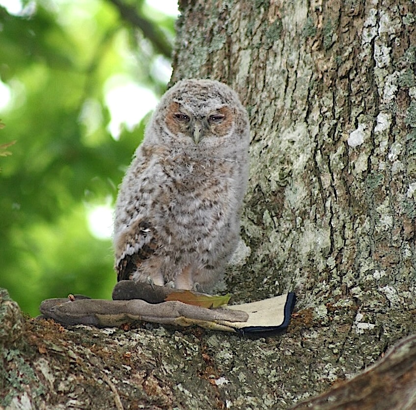 Rescued from our garden having fallen out of an oak tree. Replaced in the crook of a branch about 10 feet up. Completely relaxed throughout (the owlet, I mean), and keen to retain my rescue glove as a souvenir.