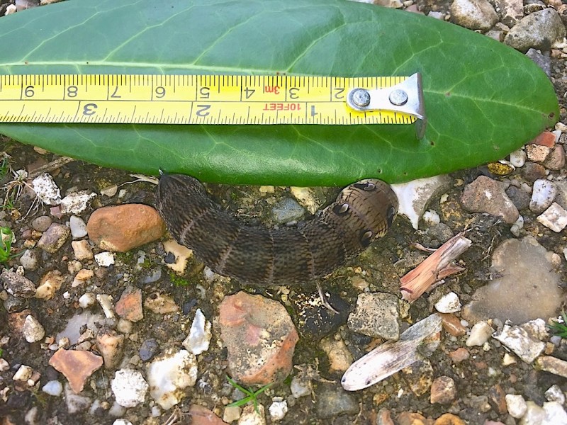 These caterpillars have three ‘poses’. The first is the usual day-to-day one, as it goes about its business with its little snout – or ‘trunk’ – extended. Note the four prominent ‘eye’ markings behind the head.