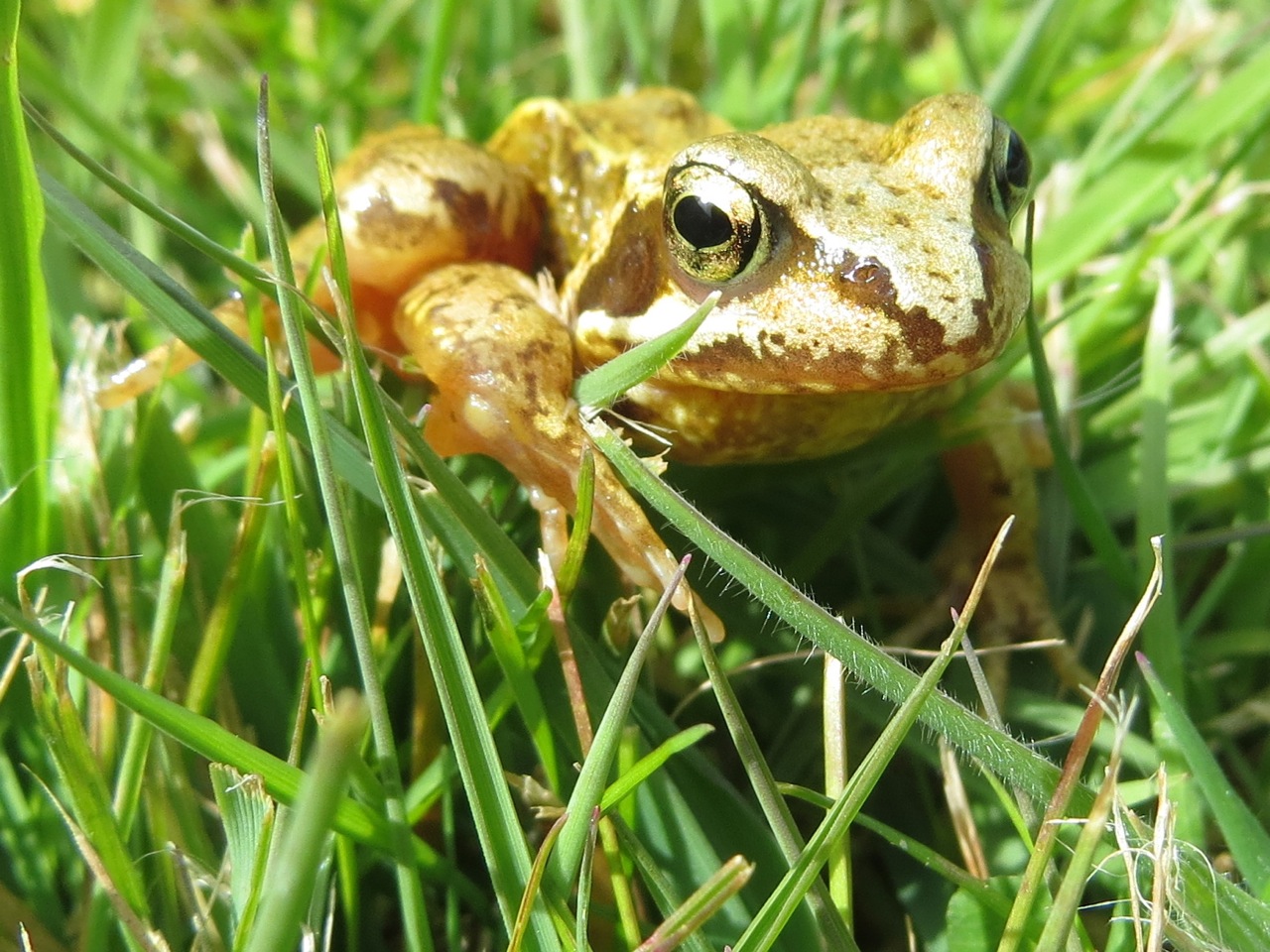 I was lying on the grass for rustic maintenance reasons when something small and greeny-yellow leapt onto my hand. And off again quickly. A tiny frog, dwarfed by mere pea-gravel, yet perfectly formed. It wasn’t in a hurry so I ran indoors, grabbed a camera, and had a leisurely photo session with it. I assume it’s just a juvenile common or garden frog Croakus vulgaris frequentis, but if anyone knows different I’d be pleased to know. You can see me reflected in the frog’s eye in the header image.