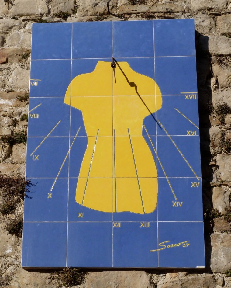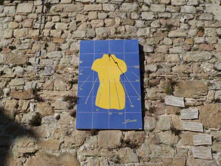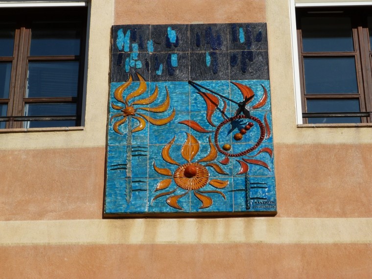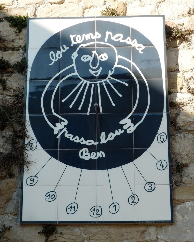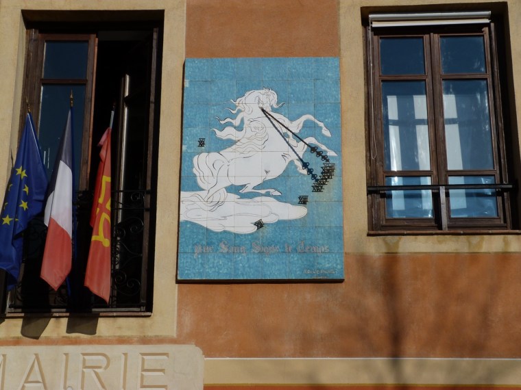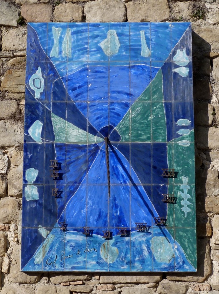 The sundials shown below are in Coaraze, a small medieval ‘village perché’ (650m) in the Alpes-Maritimes, Provence, north of Nice. They include sundials by artistic polymath Jean Cocteau, novelist, poet, dramatist, designer, artist and filmmaker; Ponce de Leon; and Henri Goetz, among others. They are located in two places in the village (1) on the front and side walls of the Marie (2) at the top of the village on a south-facing walls in the square in front of the church
