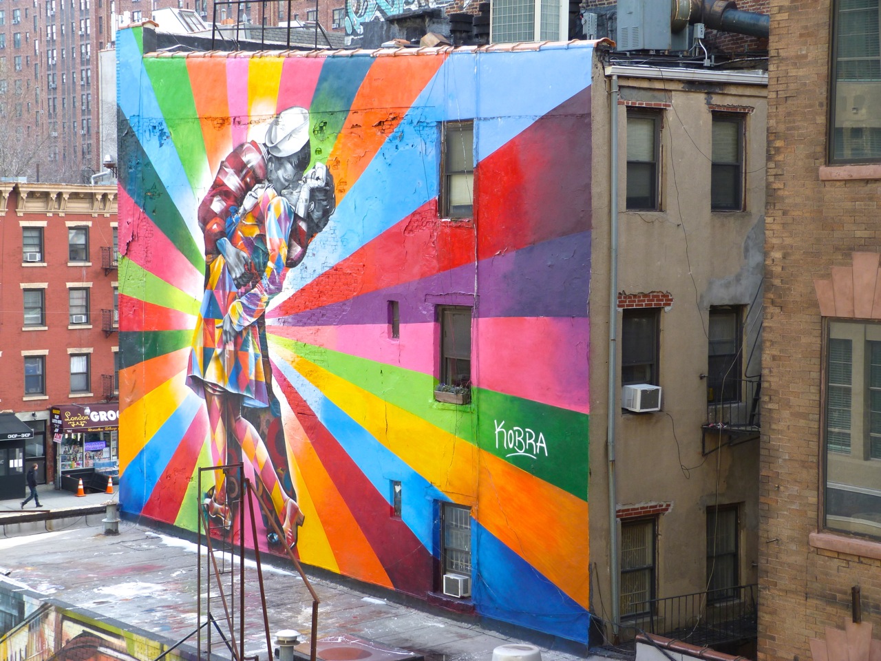 The line has been imaginatively redesigned and extensively planted as an ‘aerial greenway’. Many reminders of its former life have been incorporated, including sections of track; and the line cuts through a number of large office blocks. Along the way, there are a number of access points. There are plenty of neat ‘mini-platform’ wooden seats from which to contemplate the scenery or the urban art; and areas with larger wooden seats long enough to lie on, as with a sun lounger. Some of these are doubles…