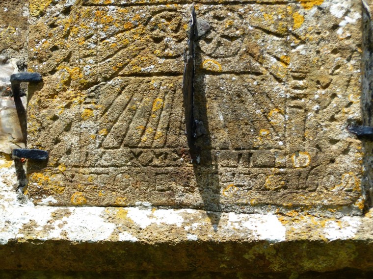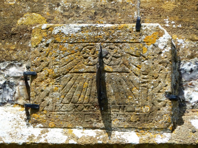 As you can see, centrally above the porch entrance is, firstly, a badly degraded tablet (only the letter A is clearly visible). Above it is a fine, well-defined sundial. Probably, the experts would not call it a mass dial at all, since it is not actually cut into the church’s stonework, but is on its own block stapled (now anyway) to the church wall. As British History Online (a great resource) puts it, Sundial: Above entry to S. porch, rectangular stone slab with enriched border, Roman numerals, wrought-iron gnomon and date 1602.