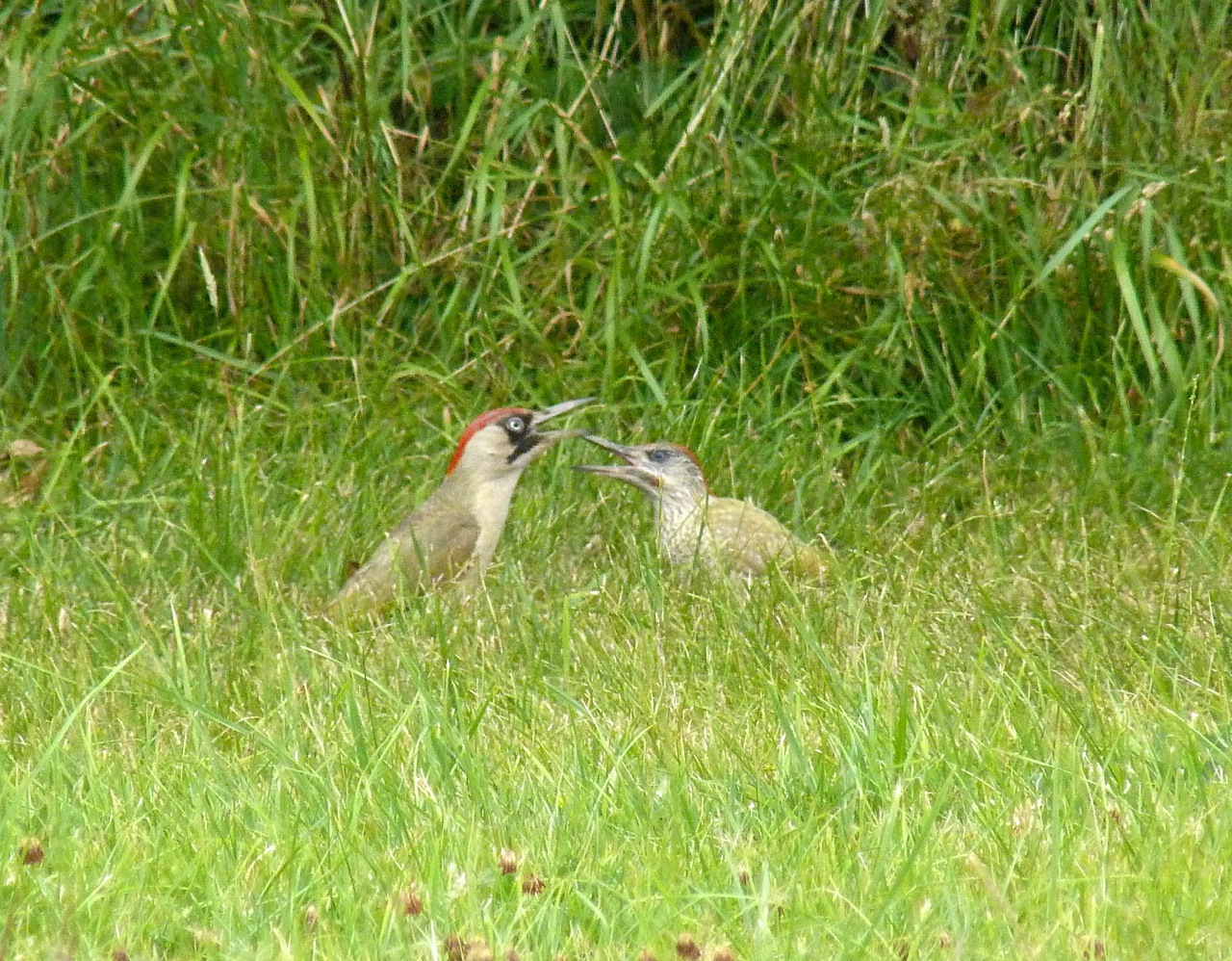 This morning my attention was caught by some inept avian fluttering in our field. Two birds, medium size. A flash of red on the head, and a large beak: green woodpeckers. The lack of vivid green ruled out adult males – this was a mother / fledgling education lesson in flying and self-sufficiency. By the time I had grabbed a camera from the house, they had moved further away. I had to creep up to the field fence so as not to scare them, and fire off some distance shots from a slightly awkward position (avoiding barbed wire was one issue). These are quite poor images, as photographs go. But the story is a good and rather sweet one…
